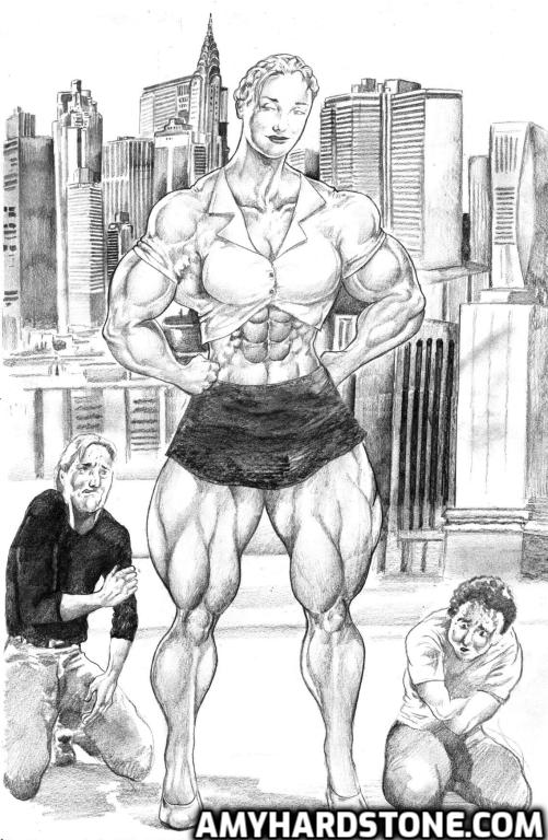 Mike measures Olga. 52 inch chest, so she explained that when she gets her sex life going again, everything will get bigger. She goes to a club and was refused entry, after a short altercation she steps over the bouncer into the club. Inside, some guy puts his hand up her skirt, so she brought her legs together, turned to face him, he didn't move quickly enough and his arm broke. The Olga finds a suitable dance partner; her idea of suitable means small and weak. She picked him up and took him to the dance floor, and held him close to her body as she fucked him then let him down to the floor; he was crying. When she got home, Mike was still awake, so she told him how she got mugged on the way home, and how she punished each of the would-be muggers. Then she took Mike to bed, her sixth sex of the evening. Next day, Olga tries to get a job. She was rejected as a waitress because of her size, she was rejected for heavy manual labour, because she's a girl, but she went back to the club and got a job there as a female bouncer. At the end of the evening, she stops a fight betwen two guys with a fist to the belly of each of them. She picked them up, one under each arm, and threw them out of the club. Superb artwork by Dracowhip.